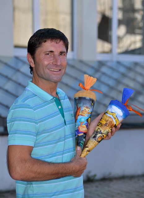 Der Bürgermeisterkandidat der PWU hatte kleine Schultüten mit Spielzeug, Bleistiften und diversen Naschereien gepackt.