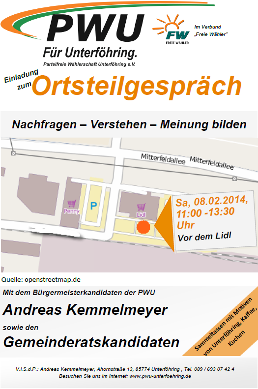 Sichern Sie sich am Samstag, 08.02.2014 von 11:00 bis 13:30 Uhr am Lidl in Unterföhring Süd, nicht nur einen Einblick in das Arbeitspapier der PWU, sondern die aktuelle Kaffeetassenserie mit verschiedenen Motiven Unterföhrings.