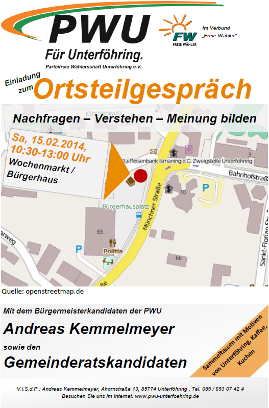 Mit Hilfe von zwei äußerste detailreichen Luftbildaufnahmen (gesamtes Gemeindegebiet sowie östliche und westliche Seite mit der S-Bahn als zentrale Achse) können Andreas Kemmelmeyer und die PWU-Gemeinderatskandidaten zielgerichtet Auskunft über die weiteren Planungen und Herausforderungen für den Zeitraum von 2014-2020 geben. So aktuell haben Sie Unterföhring noch nie von oben gesehen. Nutzen Sie beim kommenden Ortsteilgespräch die Möglichkeit Unterföhring aus einer ganz anderen Perspektive kennen zu lernen und lassen Sie sich den Kaffee und Kuchen schmecken.