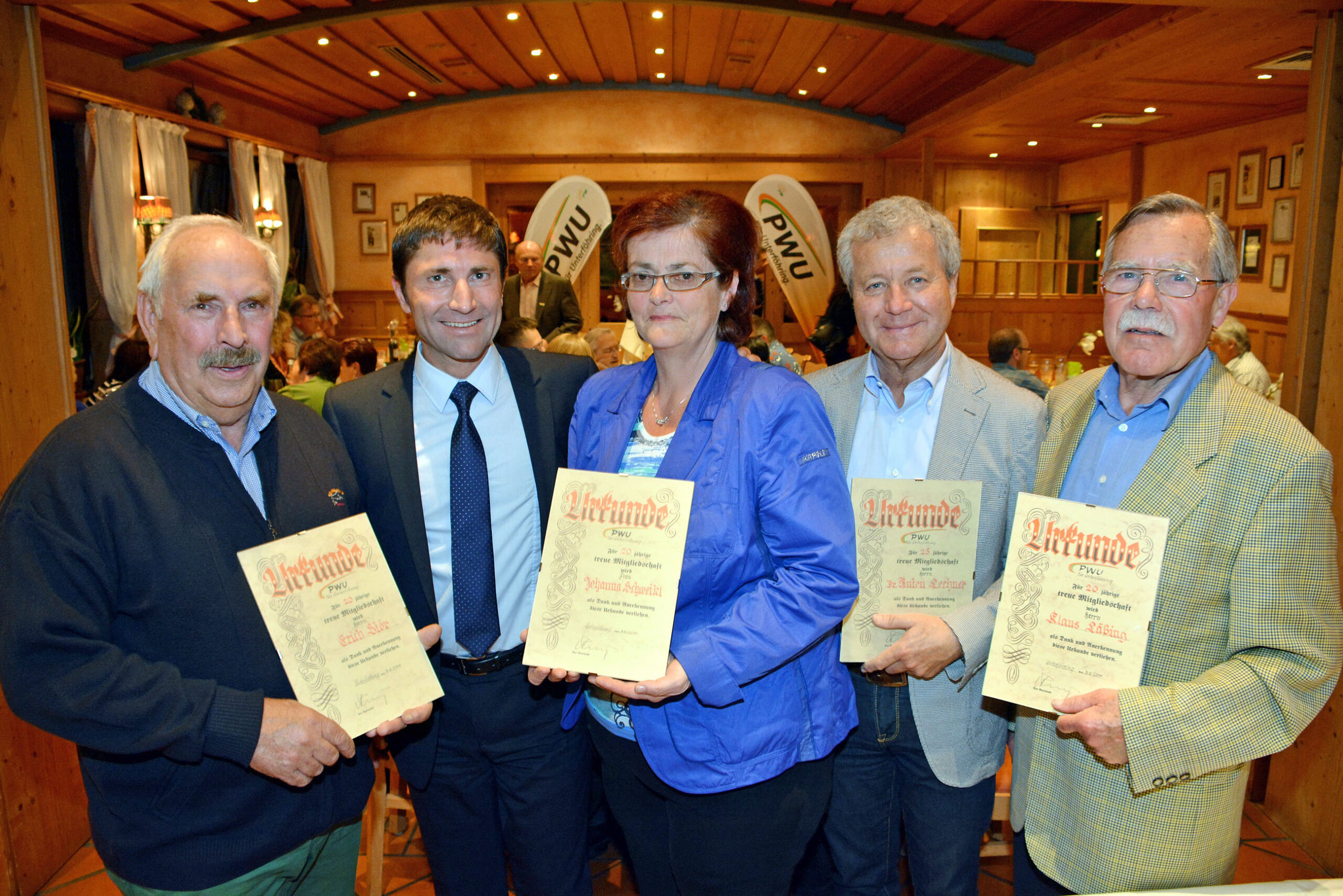 Die PWU nutzte den Rahmen der mit über 60 Gästen sehr gut besuchten Versammlung aber auch, um einige langjährige Mitglieder zu ehren und ihnen für die Treue zu danken. Dr. Anton Lechner, Cornelia Pech und Ursula Pech gehören der Gruppierung seit 25 Jahren an. Auf jeweils 20 Jahre in den Reihen der Parteifreien Wählerschaft kommen der ehemalige Bürgermeister Klaus Läßing, Johanna Schweikl, Erich Stör und Rudolf Grießbeck.